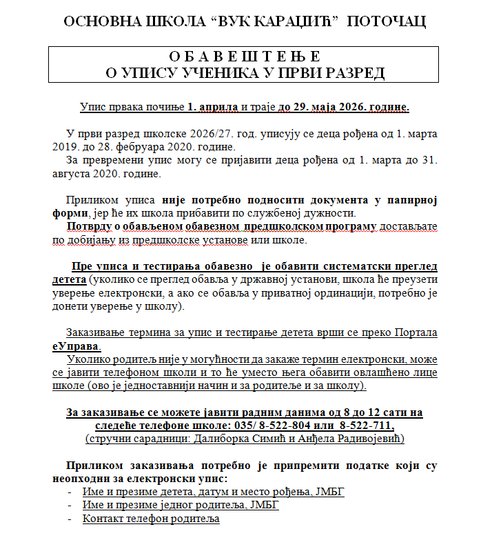 Обавештење о упису ученика у први разред